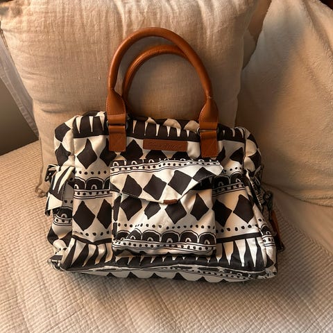 Myydään kauniskuvioinen Elodie Detailsin hoitolaukku. Laukku sisältää erillisen, konepestävän vauvan hoitoalustan, paljon taskuja sekä eristetyn tuttipullotaskun. Vedenkestävä kangas, helppo pitää puhtaana. Toinen vetoketju hajonnut, mutta ei haittaa käytössä. Pientä tahraa sisävuoressa, ei kuitenkaan hypi silmille. Toisessa kahvassa sekä metalliosissa kulumaa, kts. tarkemmin kuvat.