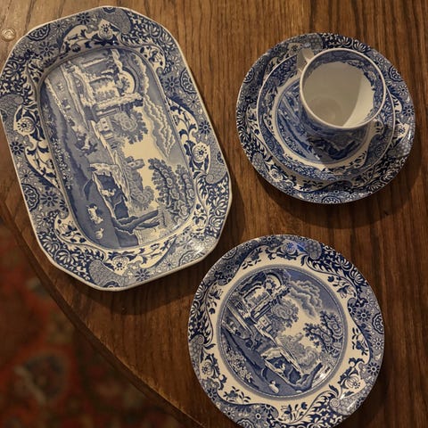 Asiasanoja: blue onion kuvio , terriini , keittokulho , sinivalkoinen , flow blue , England fine China , liemikulho , soppakulho , tarjoilulautanen , tarjoilulautaset , tarjoilulautasia , sininen kuvio , antiikkia , kattaus , tarjoilu , antiikki , astia , astiat , astioita