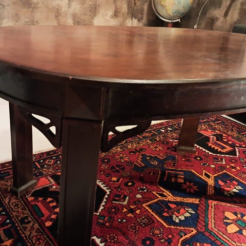 Pöytä on tukeva ja siistissä kunnossa. Muotoilunsa ansiosta se sopii mainiosti niin moderniin kuin perinteisempäänkin sisustukseen. Pöydän alla pöyrät, helppo siirtää ja liikutella mm. siivouksen yhteydessä.