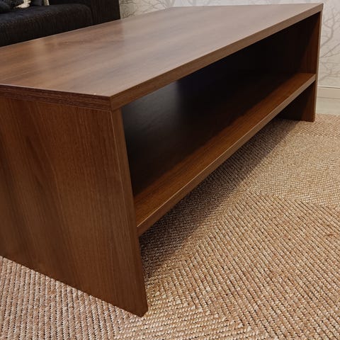 Tyylikäs kirsikan/pähkinän värinen sohvapöytä hyllyllä
