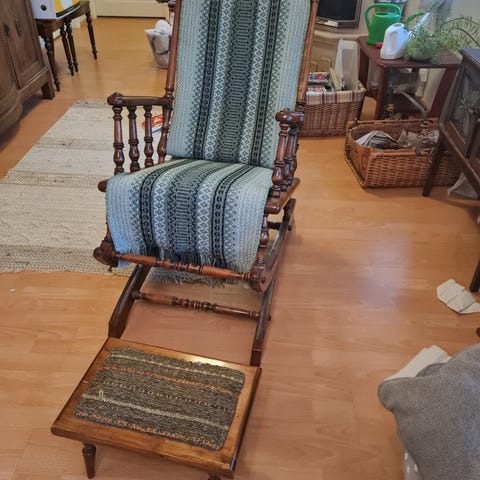 Hyvänkuntoinen Vintage Thonet -keinutuoli. Valmistettu pyökistä – selkänoja punottua verkkoa, istuintyyny pehmustettu.