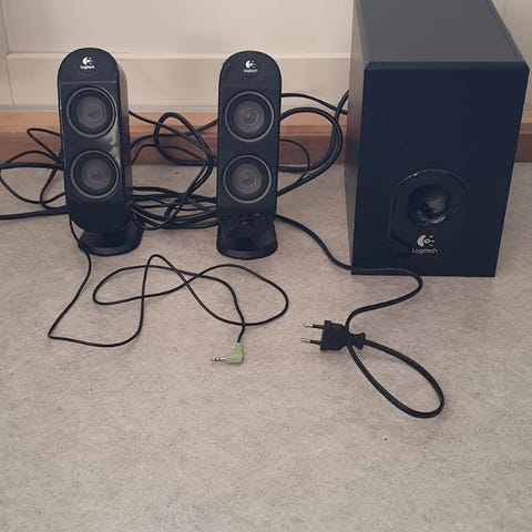 Myydään Logitechin kaiuttimet. Kaiuttimissa kuulokeliitäntä sekä bassokajarissa erillinen äänenvoimakkuudensäädin.