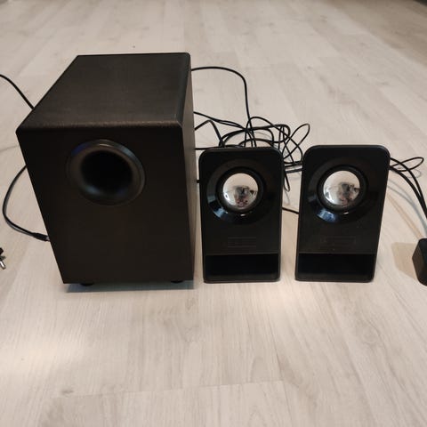 Logitechin Z3 2.1 kaiutinjärjestelmä. Yllättävän paljon lähtee ääntä ja bassoa. 3,5 mm auxilla saa soitettua mistä haluaa. Vain nouto.