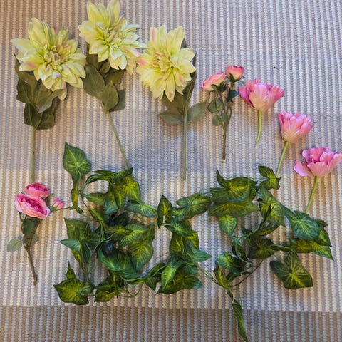 Sekalainen setti tekokukkia esim. Kuvausseinässä käytettäväksi tai pöytäkoristeiksi.