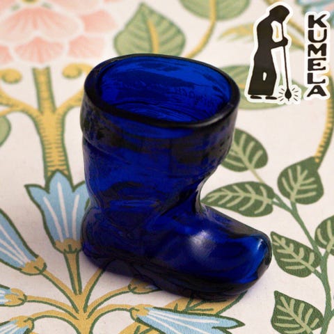 Suloinen vihreä lapikas-muotoinen snapsi, joka sopii muotonsa ja kokonsa puolesta erinomaisesti myös hammastikkutelineeksi. Ikoninen suomalainen design-esine, valmistettu Riihimäen Kumelassa, missä Kumelan Lasitehdas Oy toimi vuosina 1936-1985. Tehtaan perustivat veljekset Toivo, Ilmari ja Oiva Kumela.