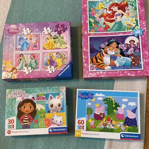 Myydään palapelit mielellään settinä, toki voin myydä yksitellenkin. Disney prinsessa aiheiset palapelit + Gabby, joissa kaikissa 30-60 palaa.