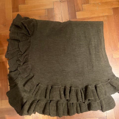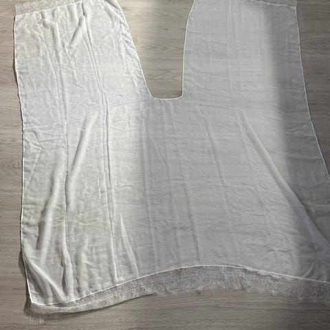 Huivi 96 x 100 cm, reunapitsi 2 cm. Huivin paino 50 g, kevyt, laskeutuva, käteen tuntuu silkiltä, mutta ei voi olla varma, sillä lappua ei löydy. Huom. reunapitsi jäänyt ompeleen alle muutamassa kohdassa.