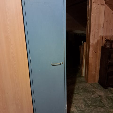 Oven etureunan kapea lista vaatii uudelleenkiinnityksen, on irronnut naulauksesta. Oikean puoleinen ovi hankaa, joten vaatii hiontaa tms. Pientä elämänjälkeä, mutta tukeva isokokoinen kaappi.