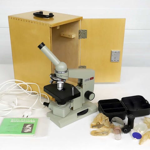 Korkealaatuinen Bresser Biolux AL -mikroskooppi, jossa on monokulaarinen katselulaite ja jonka suurennosalue on 20X - 1280X. Mukana lisävarusteita, usb-kamera, sekä cd.