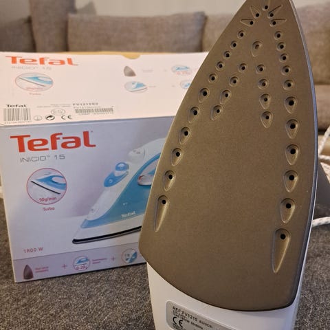 Tefal höyrysilitysrauta, malli FV-1215/A. Kunnossa oleva ja toimiva laite. Pohjan molemmille reunoille tullut jälkiä/pinttymiä, jotka eivät vaikuta silityksen jälkeen.