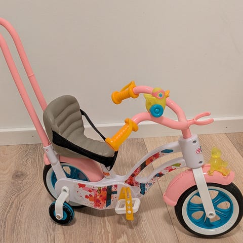 Baby Born lasten polkupyörä, jossa on apupyörät ja turvatuoli lelunukkeille. Mukana lasten kypärä, jossa koristekuvioita.