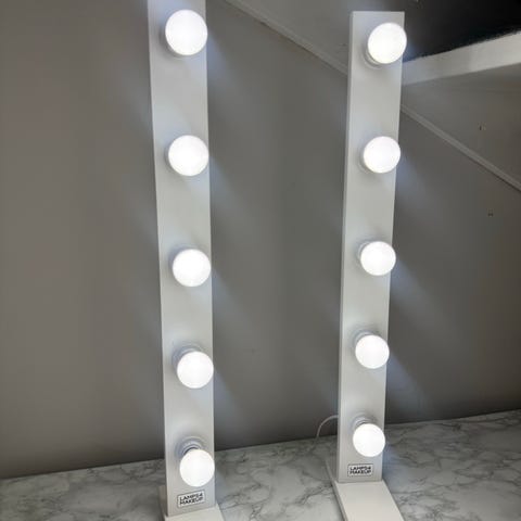 Lamps4makeupilta tilatut valot ja itse lamput olleet käytössä max 15min! Eli valot ovat kuin uudet. Näihin plussana vaihdettavat lamput! :) Laitan linkin tuotesivusta alas. Itsellä ei näille sitten kuitenkaan tarvetta ollut eikä enää mahdu mihinkään. Toisen valon puuosassa on jo lähetyksessä tapahtunut vaurio eli tuo pieni halkeama, joka on pinnassa eikä vaikuta mitenkään mihinkään. Itse valot aivan uudenveroiset.