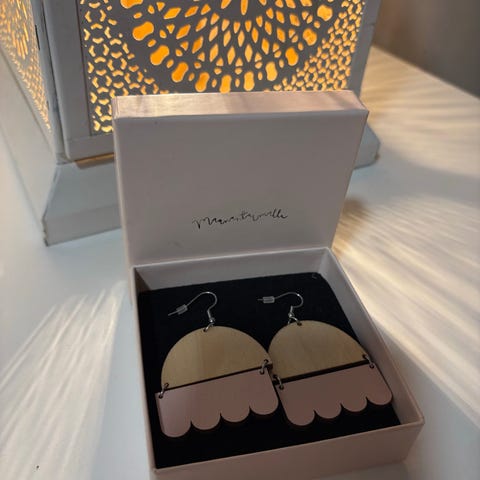 Myydään ihanat suomalaista käsityötä olevat puiset korvakorut. Korut ovat käyttämättömät.