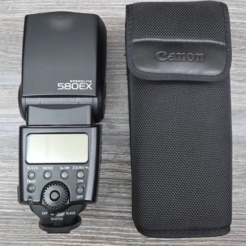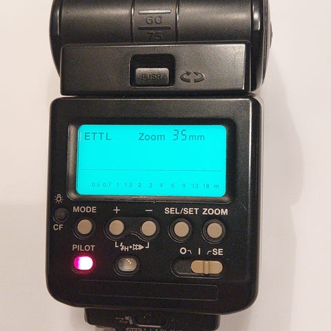 Toimiva tehokas (GN55) käsisalama kääntyvällä ja zoomattavalla välähdyspäällä. E-TTL / TTL salamaohjaus. Suojapussi mukana. Toinen samanlainen eri ilmoituksessa. 40e/kpl, 70e/2kpl.