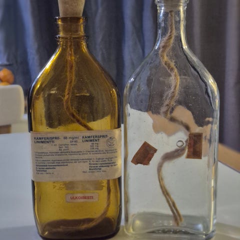 Myyn eri ikäisiä vanhoja lääke- ja kemikaalipulloja 10 kpl. Suurin on tilavuudeltaan 100 ml, loput pienempiä. Osassa etiketti, osassa ei. Yksi pulloista on ruskeasta lasista valmistettu hioskorkillinen pipettipullo. Hinta koko setille.