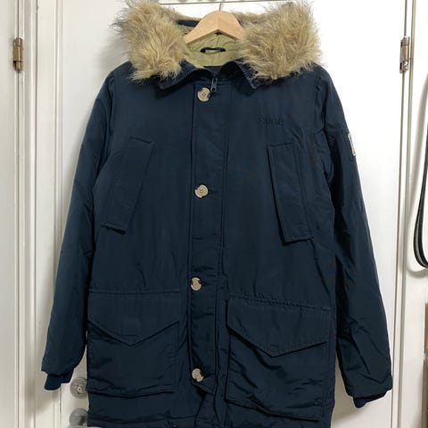 Tummansininen Svea Smith miesten untuvatakki/talvitakki koko S (unisex tyyli, sopii hyvin naisille). Kainalo-kainalo 55cm, pituus 80cm.
