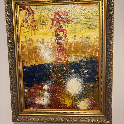 Värikäs abstrakti maalaus, jossa on käytetty voimakkaita punaisen, keltaisen ja valkoisen sävyjä mustalla pohjalla. Teos on signeerattu ja päivätty vuodelle 2005, ja sen nimi on 'Love and Peace'. Kehys on hopeanvärinen ja siinä on havaittavissa kulumisen merkkejä, kuten naarmuja ja pieniä kolhuja. Maalauksen pinta on eläväinen ja tekstuurinen, mikä tuo teokseen syvyyttä ja liikettä.