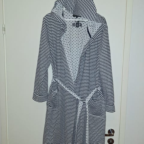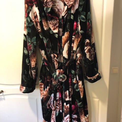 Lämmin kylpytakki. Yleisilmeeltään siisti. Kuitenkin alusta asti yksi langanpätkä ollut purkaantunut, ei kuitenkaan enempää lähde purkaantunaan. Helppo ommella kuntoon halutessaan. Kuva molemmin puolin tätä kohtaa otettu. Kappahallista ostettu. Koko 40/42.