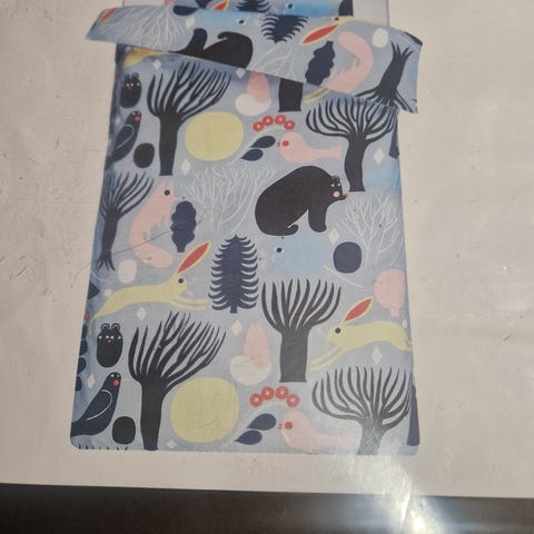 Pussilakana koko noin 120x150cm ja tyynyliina noin 40x60cm. Mukaan myös toinen tyynyliina, mistä kuva.
