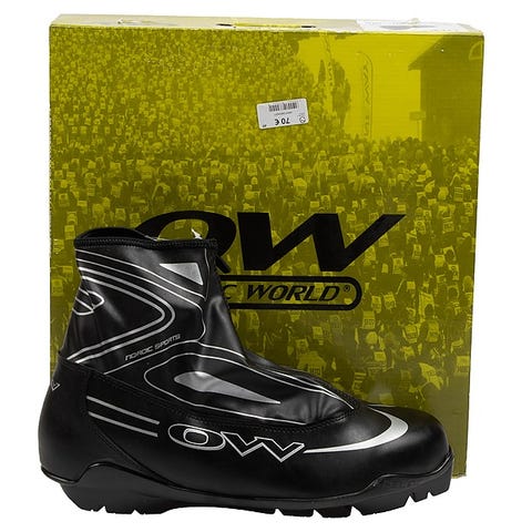 Musta-hopeiset OW Tigara -hiihtokengät korkealla varrella ja suojaavalla vetoketjullisella suojaläpällä nauhoituksen päällä. Kengät on valmistettu synteettisestä materiaalista, ja niissä on näkyvät hopeiset heijastavat design-elementit.