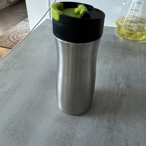 Asaklitt merkkinen vihreä termospullo. Korkki toimii mukina. Tilavuus puolisen litraa. Ehkä ja siisti.