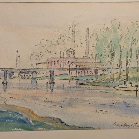 Eero Snellmanin akvarellityö "Helsingin kattoja". Työn korkeus on 20 cm ja leveys 30 cm. Kehys 28 X 37 cm.