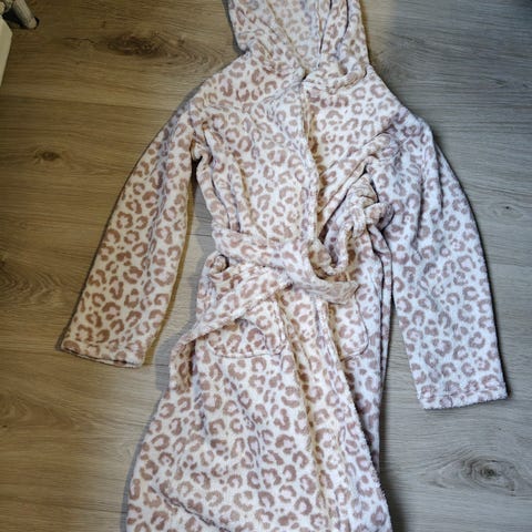 Muutaman kerran käytetty laadukas kylpytakki odottaa uutta käyttäjää. Täysin ehjä ja siisti, ei kotieläimiä taloudessa. Valmistaja Puuvillatehdas Tampere. Koko 140-150cm.
