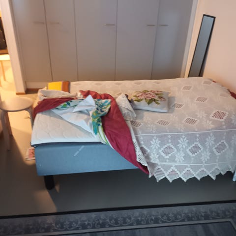 Sänky tavaratilalla, jouset ovat hyvät. Ollut vierashuoneessa satunnaisessa käytössä. Nouto. Talossa on hissi.