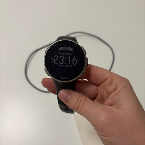 Toimiva kello, hyvällä akun kestolla. Laite on käytetty ja näytössä on joku naarmu. Mukana latauskaapeli.