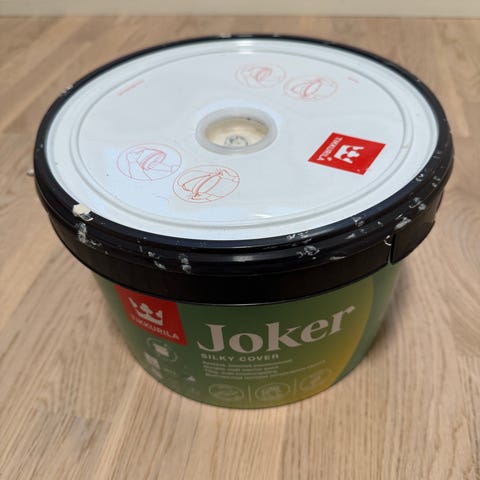 Tikkurila Joker -maali sävyssä G487 Batisti 2,7 litran säiliössä. N. pari desiä maalia käytetty, mikä huomioitu hinnassa. Nouto.