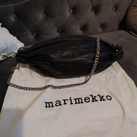 Marimekon isompi karla laukku. Tämä vanhempaa mallistoa, jossa nahka oli pehmeää ja raidan pienempiä.