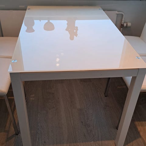 White dining table set with table and four chairs. Stable and sturdy. Some scraches on the table.