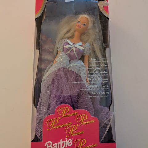 Barbie nukke 1990-luku. Mukaan alkuperäinen mekko, harja ja (kulunut) paketti.