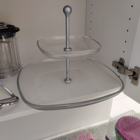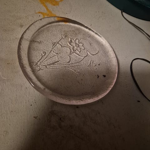 Lasinen astia metallireunuksella. Halkaisija noin 12 cm. Todennäköisesti valmistettu Puolassa. Metallissa teksti ”poland”