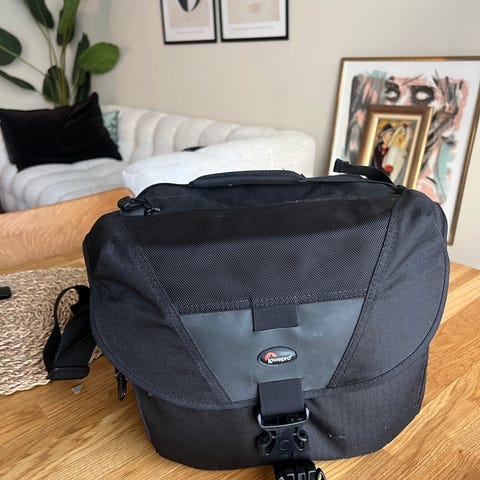 Lowepro kamerareppu, musta väri. Reppu sisältää useita säädettäviä lokeroita kameravarusteille ja lisäosille (ks. kuvat).