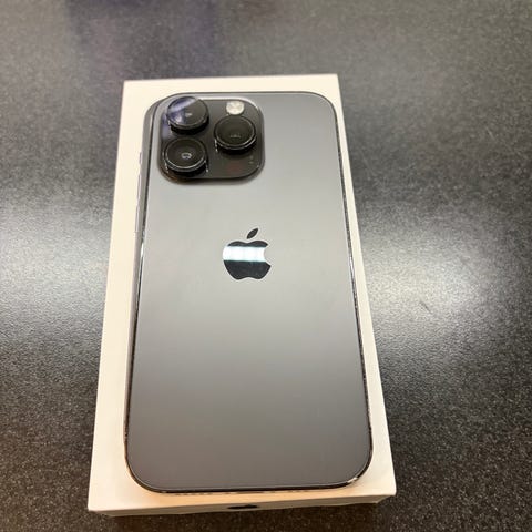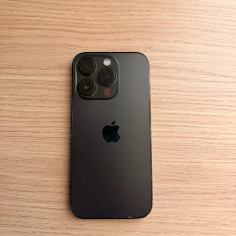 Hyvässä käytetyssä kunnossa Apple iPhone 14 Pro 128 GB. Väri Space Black. Akun kapasiteetti 86%. Kuvissa näkyy käytön jälkiä ja naarmuja laitteen reunoissa.
