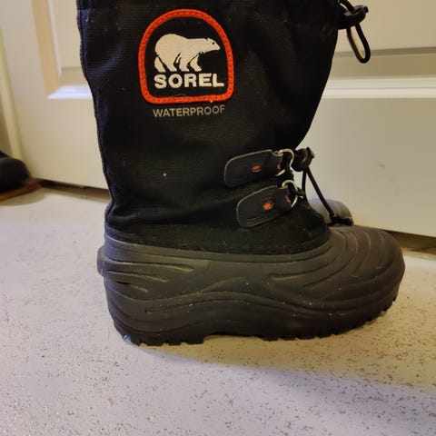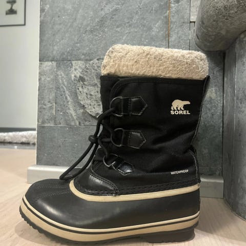 Sorel lasten talvikengät, koko 34, unisex-malli. Mustat vedenpitävät kengät, joissa lämmin vuori ja säädettävät nauhat. Sopivat kylmiin ja kosteisiin olosuhteisiin.