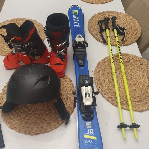 Toimiva setti mäenlaskuun. Pohjissa muutama naarmu. Koot näkyy kuvissa.