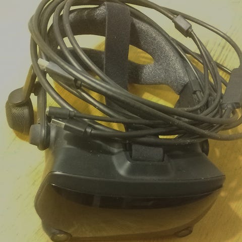 Vähällä käytöllä olleet virtuaalilasit oheislaitteineen.