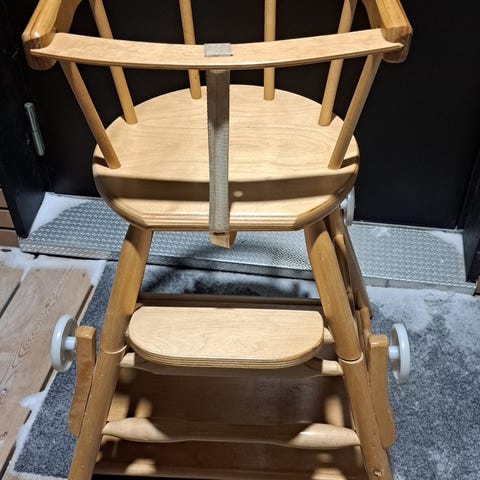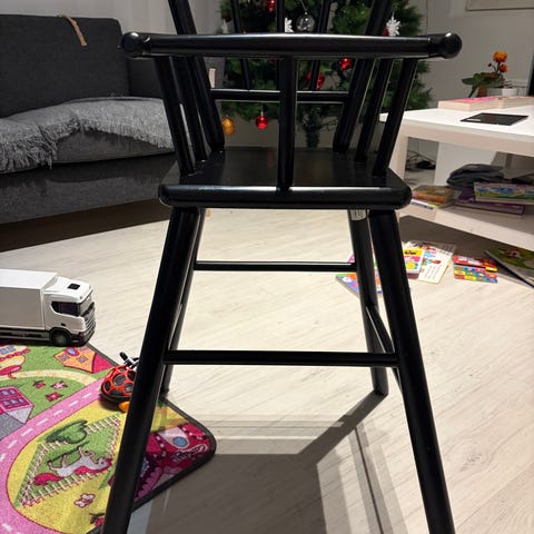 Aito retro syöttötuoli 70-luvulta, tummanruskea. Erinomaisessa kunnossa ikäisekseen. Taitettavissa pöydäksi ja tuoliksi, jolloin renkaat alla ja helposti liikuteltavissa.