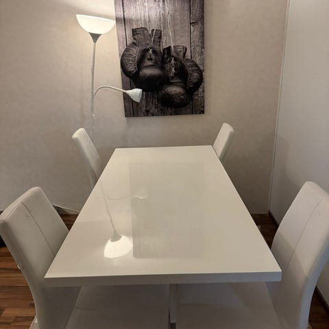 Calligaris italialainen design ruokailuryhmä, pöytä (140cm) + 2 kpl 30 cm jatkopalaa. 6 kpl tuolia. Jatkopalat menee kätevästi pöydän alle. Kunto erittäin hyvä.