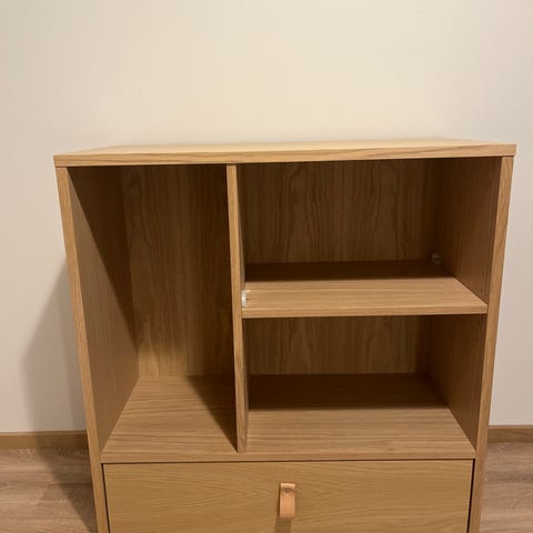 Hyväkuntoinen kaappi/ hylly uuteen kotiin. Kaksi kaappia, joista ylempi lasiovinen. Kaksi laatikkoa keskellä.