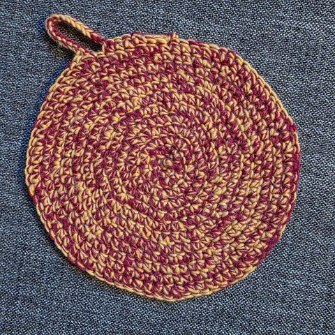 Käsintehty pyöreä patalappu, halkaisija noin 22 cm. Väri vaaleanpunainen, materiaali käsin virkattu lanka. Soveltuu keittiökäyttöön kuumien astioiden käsittelyyn.