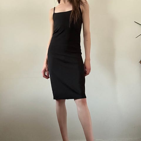 Avoin musta mekko. Satiinin tuntuista kangasta. Joustava materiaali ja tuplakangas. Ostettu Vintedistä kategoriasta ”uusi ilman hintalappua”. Pieni nyppy kuitenkin helmassa.