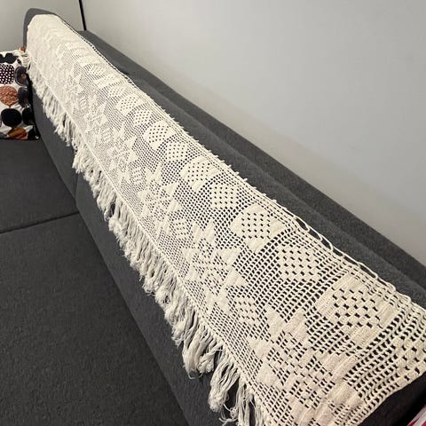 Kalastajanlangalla virkattu verhokappa. Tahraton, tuskin koskaan käytetty. 180cmx47cm