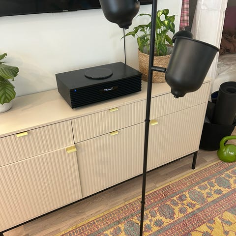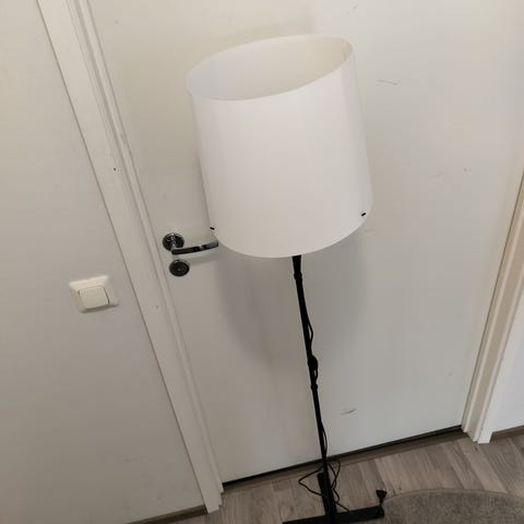 Siistikuntoinen lattiavalaisin. Valkoinen tekstiilivarjostin. Tukeva metallinen jalka. Korkeutta voi säätää tarpeen mukaan.