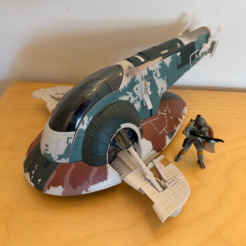 Star Wars Boba Fettin Slave 1 -lelu, jossa on avattavat osat ja yksityiskohtainen muotoilu. Joku osa saattaa puuttua.