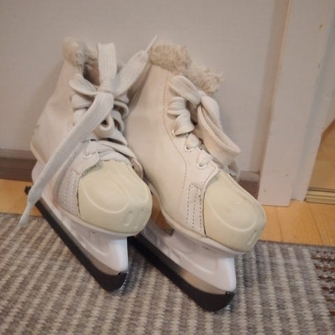 Viime talvena uutena ostetut luistimet. Terän päästä hiottu alimmaiset kaunokkien harpit pois. Luistimet teroitettu eli heti käyttöön valmiit.