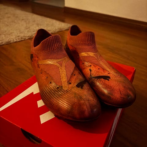 Puma jalkapallokengät koko 36 oranssissa värissä. Kengissä on nauhakiinnitys ja kovat nappulapohjat, jotka soveltuvat nurmialustoille. Kengät on suunniteltu tarjoamaan tukea ja pitoa jalkapallopelissä. Nouto/posti