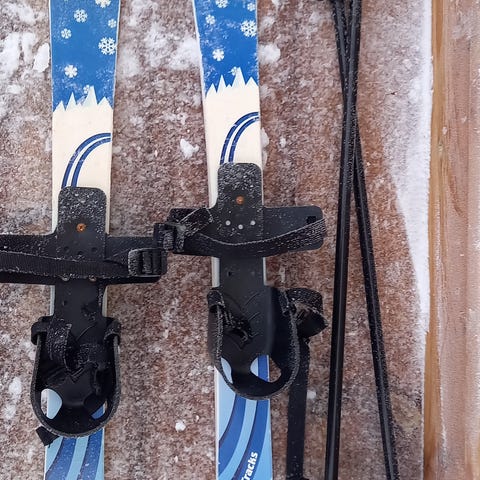 Yhdellä lapsella olleet Madshusin 90 cm pitokarvasukset. Side Rottefella Start. Pohjat luistovoideltu.